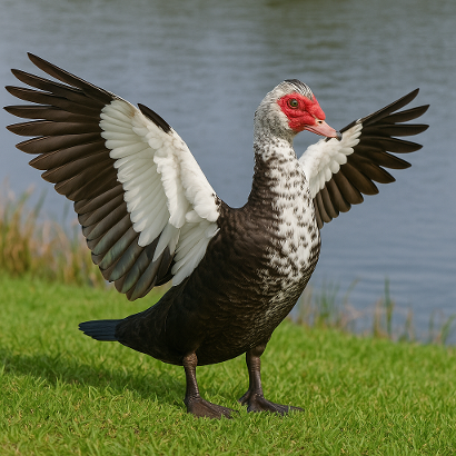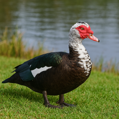 Muscovy ducks are quiet compared to other ducks and don’t quack—instead, they make low hisses and soft coos. They are excellent fliers for their size and can roost in trees. They’re also very social and often travel in family groups. One unique feature is the red, bumpy skin (caruncles) around their beak, which becomes more pronounced as they age.